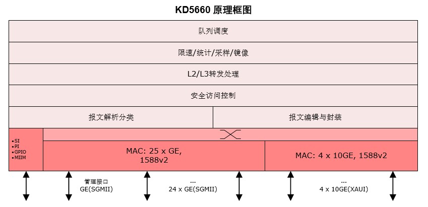KD5660 包含 24 个 GE 接口、 4 个 10GE 接 口以及 1 个 GE 管理端口,所有网络转发业务均 可在最小 64 字节报文情况下达到 64Gbps 的最 高性能。可支持 L2/L3 交换、IP 单播组播路由、 安全访问控制 ACL 和流量管理功能,并可支持多样灵活的报文流分类特性以及丰富的管理控制接口。