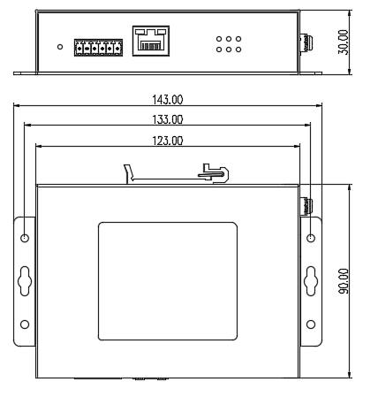 | 物理特性 | 外壳:金属材质 尺寸:123mm×30mm×90mm(W×H×D) 包装尺寸:236mm×197mm×70mm 散热方式:自然冷却,无风扇 防护等级:IP40 安装方式:壁挂,导轨 |