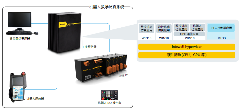 - 工业服务器实现将多个仿真应用与PLC控制器应用运行在同一个物理硬件上,节省了教学硬件的设备空间及成本。