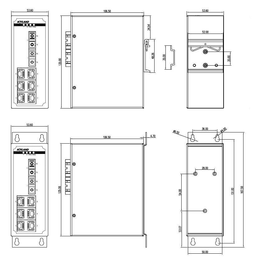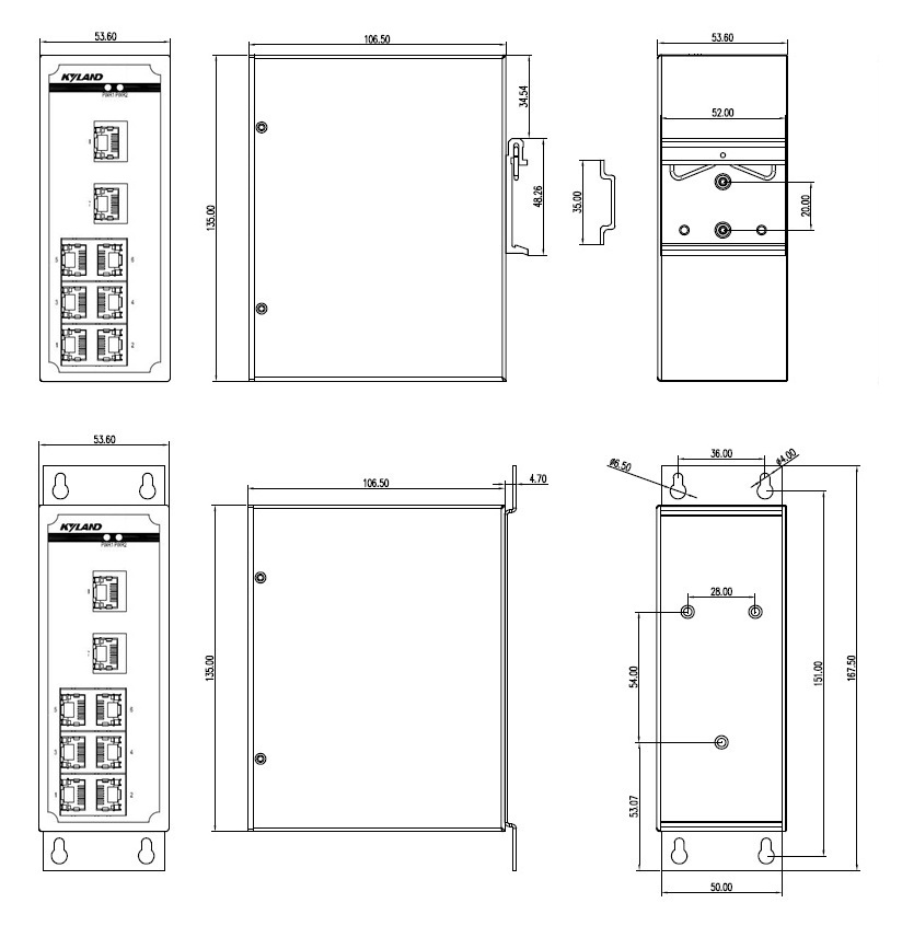 | 机械结构 | 外壳 金属材质 散热方式 自然冷却,无风扇 防护等级 IP40 尺寸 53.6mm×135mm×106.5mm (W×H×D) 重量 0.76Kg 安装方式 DIN卡轨式或壁挂式 |