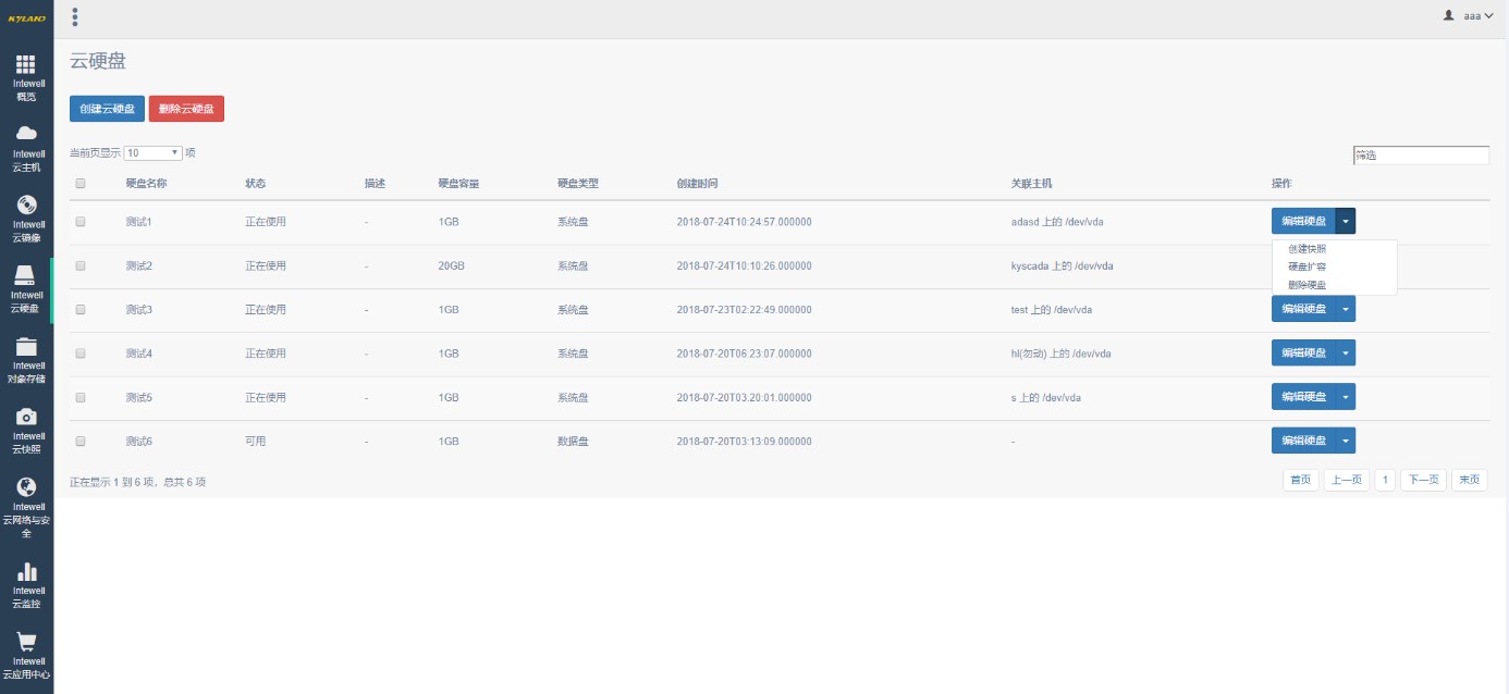 | 云硬盘 | 支持创建、删除云硬盘 支持挂载云硬盘到云主机 支持云硬盘快照 支持云硬盘导出、备份、恢复 支持云硬盘扩容 支持云硬盘QoS 支持存储高可用 ![]() |