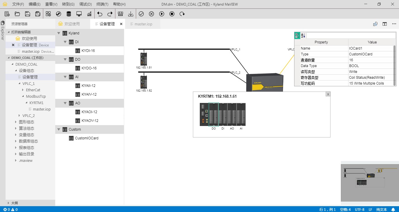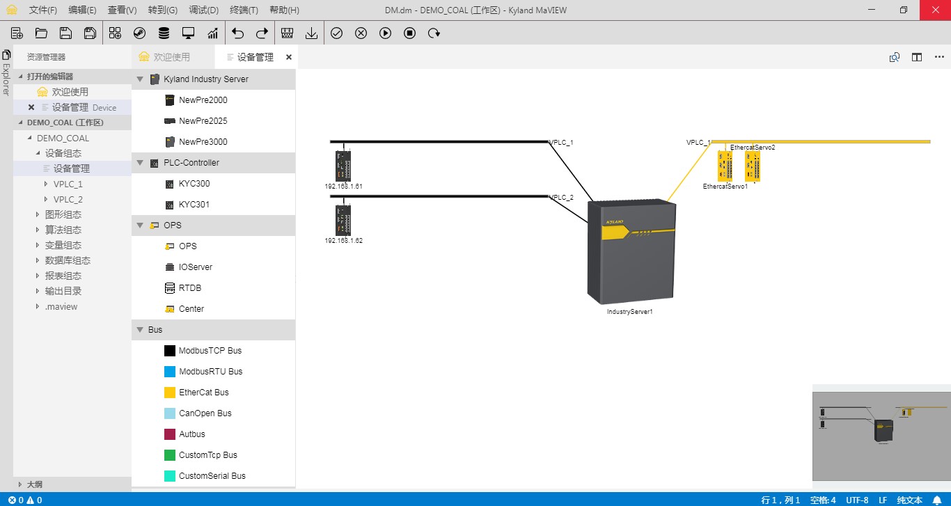 | 设备组态 | 图形化拖拽式添加设备,含东土工业服务器,东土PLC控制器,业务总线以及远程IO设备 提供缩略图窗口支持快速定位 工业服务器冗余配置 业务总线包括Modbus TCP,Modbus RTU,EtherCAT,CANopen,AUTBUS以及自定义TCP和自定义串口 支持配置总线关联控制器,物理端口和IP信息 支持配置添加东土IO设备及第三方IO设备,自动生成IO变量 ![]() ![]() |