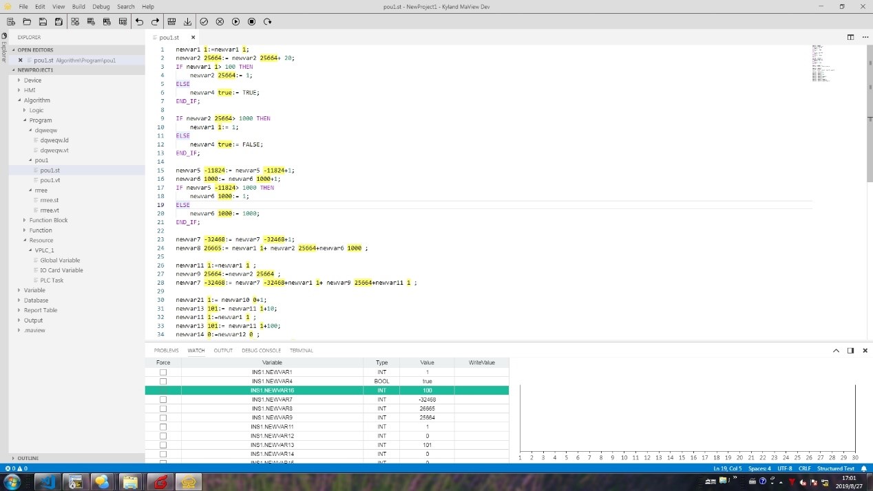| 算法组态 | -算法组态 支持IEC61131-3 ST,LD,FBD编程语言 每个虚拟PLC支持配置多达10个不同优先等级和周期的实例任务 变量声明支持导入导出功能 算法程序文件导入导出 支持控制器的全局变量管理及IO变量管理 支持功能块的结构体引用 变量、语句联想功能 变量掉电保持定义 提供变量全局搜索功能,支持直接跳转程序 -C++支持 提供独立的MaVIEW Lib Developer工具用于创建C++的库 支持导入C++源码文件 支持导入Matlab/Simulink生成的C++文件 发布C++程序为Function Block模块库,可导入MaVIEW ![]() ![]() ![]() |