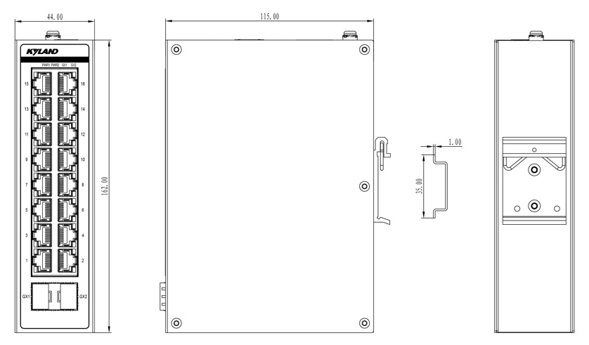 | 机械结构 | 外壳 金属材质 散热方式 自然冷却,无风扇 防护等级 IP40 尺寸 44mm×162mm×115mm (W×H×D) 重量 0.5Kg 安装方式 DIN卡轨式或壁挂式 |