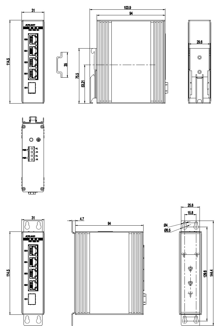 | 机械结构 | 外壳 金属材质 散热方式 自然冷却,无风扇 防护等级 IP40 尺寸 31mm×114.5mm×94mm (W×H×D) 重量 0.3Kg 安装方式 DIN卡轨式或壁挂式 |