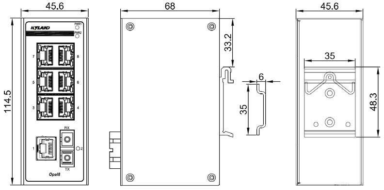 | 机械结构 | 外壳 金属材质 散热方式 自然冷却,无风扇 防护等级 IP30 尺寸 45.6mm×114.5mm×68mm(W×H×D) 重量 0.3Kg 安装方式 DIN卡轨式或壁挂式 |