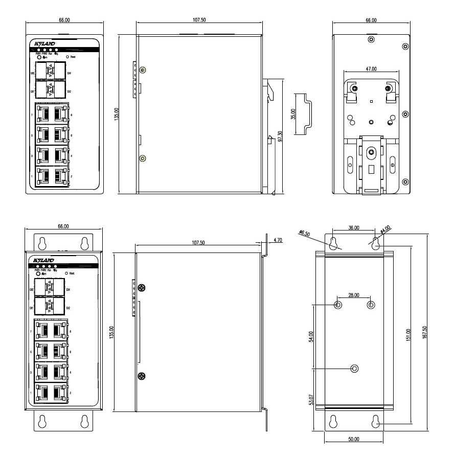 | 管理与维护 | 支持Console, Telnet, WEB管理方式 支持SNMPv1/v2c/v3,可通过Kyvision集中管理 支持SFTP/HTTP软件升级 支持电源告警, IP/MAC冲突告警, 内存/CPU利用率告警, 端口告警, 环告警, 端口流量告警, CRC及丢包率告警, SFP接口接收光功率告警和发送光功率告警 支持DDM (SFP接口) 支持环路检测 支持RMON 支持端口镜像 支持Syslog 支持LLDP 支持Link-check 支持自动配置备份和恢复 支持IPv4/IPv6 |