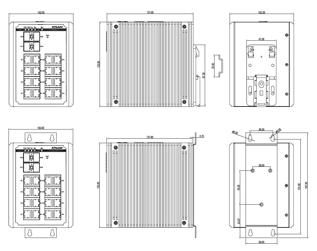 | 机械结构 | 外壳 金属材质 散热方式 自然冷却,无风扇 防护等级 IP40及以上 尺寸 66mm×135mm×107.5mm (6T,8T,2GX8T,4GX8T) (W×H×D) 88mm×135mm×137mm (8GE,2GX8GE,4GX8GE) (W×H×D) 102mm×135mm×137mm (16GE,2GX16GE,4GX16GE,8GX8GE,12GX8GE) (W×H×D) 重量 1.1Kg (6T,8T,2GX8T,4GX8T) 1.5Kg (8GE,2GX8GE,4GX8GE) 1.9Kg (16GE,2GX16GE,4GX16GE,8GX8GE,12GX8GE) 安装方式 DIN卡轨式或壁挂式 |
