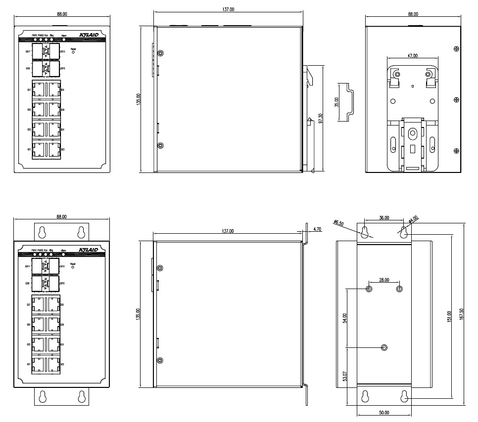 | 机械结构 | 外壳 金属材质 散热方式 自然冷却,无风扇 防护等级 IP40 尺寸 88mm×135mm×137mm (4GX8GE-HV) (W×H×D) 102mm×135mm×137mm (4GX16GE-HV) (W×H×D) 53.6mm×134mm×106mm (4GX8GE-LV) (W×H×D) 87.1mm×134mm×106mm (4GX16GE-LV) (W×H×D) 重量 1.5Kg (4GX8GE-HV) 1.9Kg (4GX16GE-HV) 0.65Kg (4GX8GE-LV) 1.0Kg (4GX16GE-LV) 安装方式 DIN卡轨式或壁挂式 |