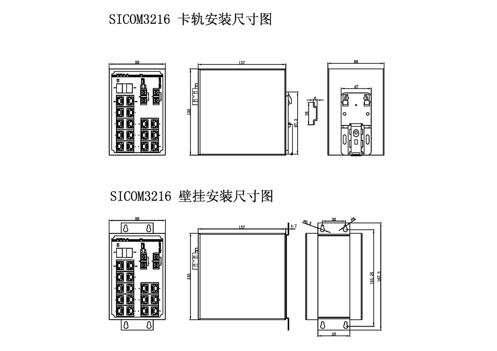 | 机械结构 | 外壳 金属材质 散热方式 自然冷却,无风扇 防护等级 IP40 尺寸 88mm×135mm×137mm(W×H×D) 重量 1.25Kg 安装方式 DIN卡轨式或壁挂式 |