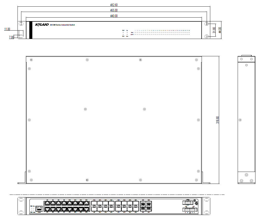 | 机械结构 | 外壳 金属材质 散热方式 自然冷却,无风扇 防护等级 IP40 尺寸 440mm×44mm×318.8mm(W×H×D) 重量 <3Kg 安装方式 19英寸1U机架式 |